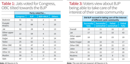 ଆସନ୍ତୁ ପୂର୍ଣ୍ଣାଙ୍ଗ ଭାବେ ଆଲୋଚନା କରିବା ଏହି ପ୍ରସଙ୍ଗରେ। କଂଗ୍ରେସର ମୁଖ୍ୟ ଚେହେରା ଥିଲେ ଭୁପିନ୍ଦର ସିଂ ହୁଡା ଏବଂ ତାଙ୍କ ପୁଅ ଦୀପେନ୍ଦ୍ର ହୁଡା। ଏମାନେ ଜାଠ ବର୍ଗରୁ ଆସନ୍ତି। ଏହି ବର୍ଗ ହରିୟାଣାର ଏକ ସମ୍ପନ୍ନ ବର୍ଗ। ଯାହାର ଲୋକସଂଖ୍ୟା ୨୨ ପ୍ରତିଶତ। ମାତ୍ର ଜାଠ କେବଳ କଂଗ୍ରେସର ଭୋଟର ନ ଥିଲେ। ଅନ୍ୟ ଦୁଇ ଆଞ୍ଚଳିକ ଦଳ । ଆଇଏନଏଲଡି ଏବଂ ଜେଜେପିର ମୁଖ୍ୟ ଭୋଟର ମଧ୍ୟ ଜାଠ ବର୍ଗ। ଯାହାର ସୁଯୋଗ ନେଲା ବିଜେପି। ଜାଠ ବହୁଳ ଅଞ୍ଚଳ ଗୁଡିକରେ ବିଜେପି ଅଣ ଜାଠ ତଥା ବହୁଳ ଭାବେ ପଛୁଆ ବର୍ଗଙ୍କୁ ପ୍ରାର୍ଥା କରିଲା। ଜାଠ ଭୋଟ ଗୁଡିକ ଉଣା ଅଧିକେ ତିନୋଟି ଦଳ ସହ ବାଣ୍ଟି ହୋଇଗଲା। ଏହି ଦଳ ଗୁଡିକ ହେଉଛି-କଂଗ୍ରେସ, ଆଇଏନଏଡି ଏବଂ ଜେଜେପି। ଏହାର ଅପରପଟରେ ବିଜେପି ପଛୁଆବର୍ଗର ସିଂହଭାଗ ଭୋଟ ସହ ଦଳିତ ଭୋଟ ପାଇଲା। ଅଶୀ ଦଶକର ଶେଷ ଭାଗରୁ ଉଚ୍ଚ ବର୍ଗର ଭୋଟ(ବ୍ରାହ୍ମଣ, କ୍ଷତ୍ରିୟ, କାୟସ୍ଥ, କ୍ଷତ୍ରି, ରାଜପୁତ୍) ଆଦି ଭୋଟ ବିଜେପି ସହ ରହିଆସିଛି। ତେଣୁ ପୁରୁଣା ଭୋଟ ବ୍ୟାଙ୍କ୍ ସହ ପଛୁଆବର୍ଗର ସିଂହଭାଗ ଏବଂ ଦଳିତ ବର୍ଗର ଏକ ଅଂଶ ବିଜେପିକୁ ବିଜୟ ଆଣିଦେଲା। ଯାହାକୁ ଲୋକନୀତି-ସିଏସଡିଏସ୍ ପକ୍ଷରୁ ଅତି ନିଖୁଣ ଭାବେ ବିଶ୍ଳେଷଣ କରାଯାଇଛି। ବିଜେପି ହରିୟାଣାରେ ବଡ଼ ବଡ଼ ରାଲି କରିବା ଅପେକ୍ଷା ବିଭିନ୍ନ ଜାତି ସମୂହ ଗୁଡିକର ଛୋଟ ଛୋଟ ବୈଠକ ଉପରେ ଗୁରୁତ୍ୱ ଦେଇଥିଲା।